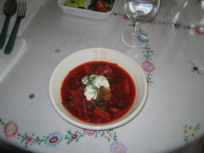 今日のメインのボルシチを食べて、Santa Rita Reserva Merlot 2003を飲む。ボルシチは赤カブの色をした、さらっとしたビーフスープという感じで、とてもおいしい。デザートにメロンと、チェリーと、ヨーグルトアイスクリームを食べる。