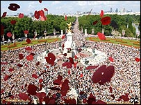 昼食はお茶漬けと、メロン。テレビで終戦60周年記念式典を見る。バッキンガム宮殿前にすごい人が集まっている。3日前のテロを考えると、日本であれば中止になっていると思うし、あったとしてもこんなに人が集まるだろうか。
